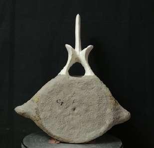 restaurados sobre el hueso original (vértebras torácicas, lumbares y caudales hasta la 15, ambos omóplatos, húmero, cúbito y radio de ambas aletas, costillas, mandíbulas). Excepcionalmente los carpos y las falanges aunque tienen color marrón son nuevos en su mayoría.