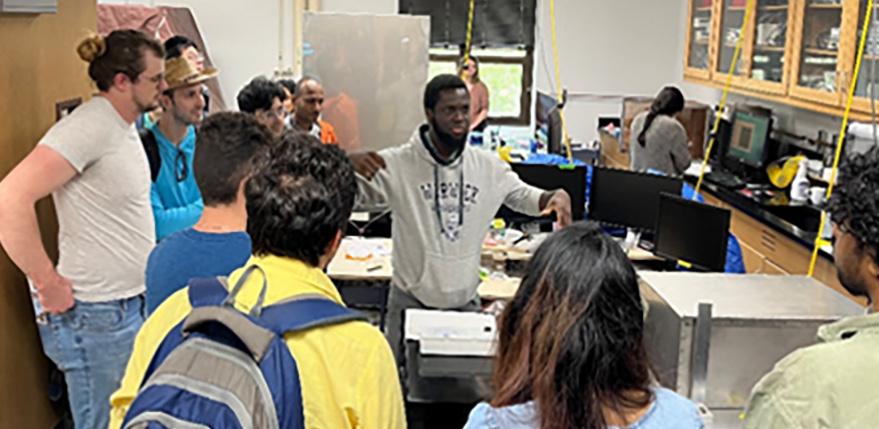 Dr. Segun Wahab describes nanoscale electrochemical characterization equipment during ECS University of Texas at Austin Student Chapter members’ visit to Lane Baker’s lab.