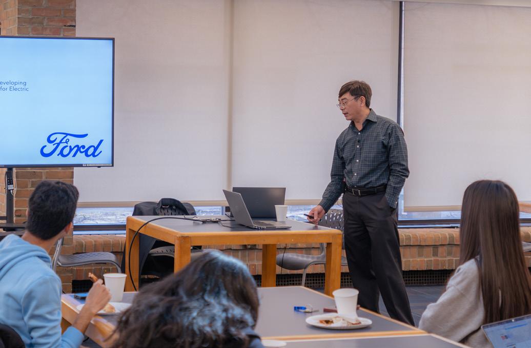 The chapter collaborated with the Mechanical Engineering Graduate Council (MEGC) to present a “Lunch and Learn” with industry and academic professionals Dr. Jeff Lowe from General Motors, Shaurya Sarna from Our Next Energy, Dr. Javier Parrondo from Nissan Motor Corporation, and UofM Assistant Professors Joshua Jack and Yiyang Li. Small group discussions were facilitated by providing each speaker with a table where attendees could enjoy a provided lunch while learning about the professional’s individual career path.