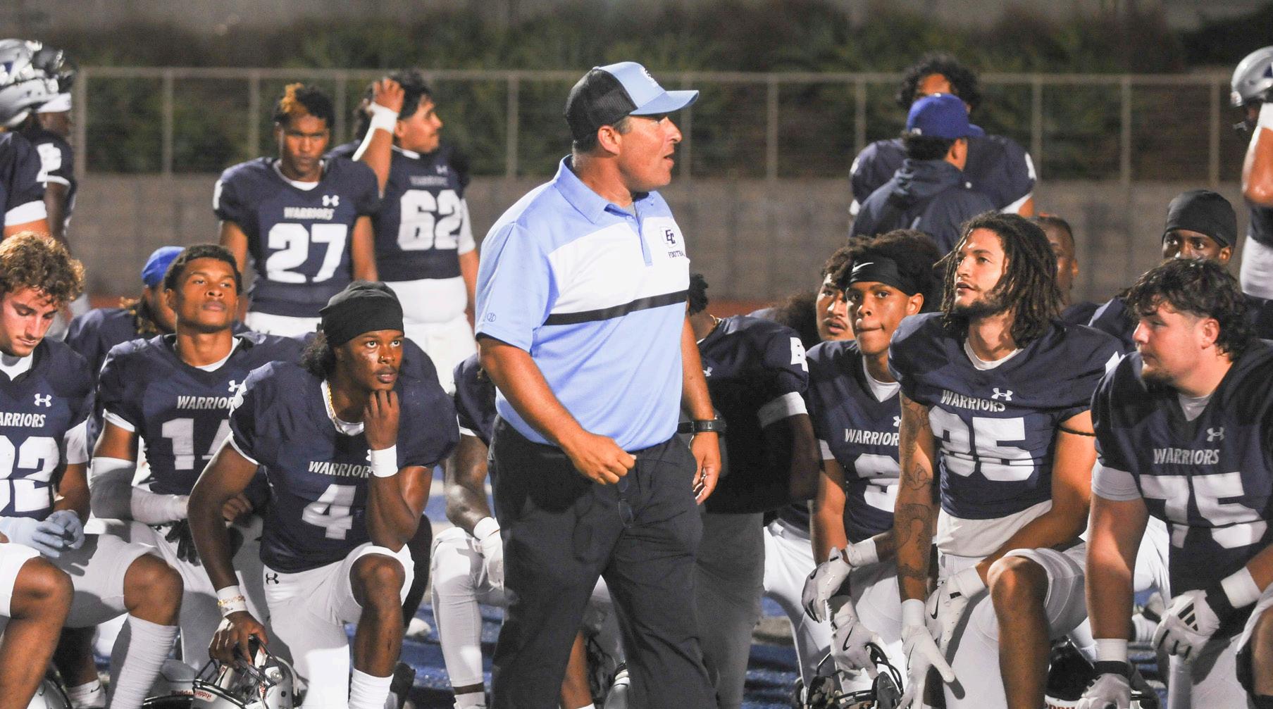 Top: Warriors coach Gifford Lindheim gives his team a victory speech after their 17-13 win against the College of the Canyons Cougars on Sept 6.