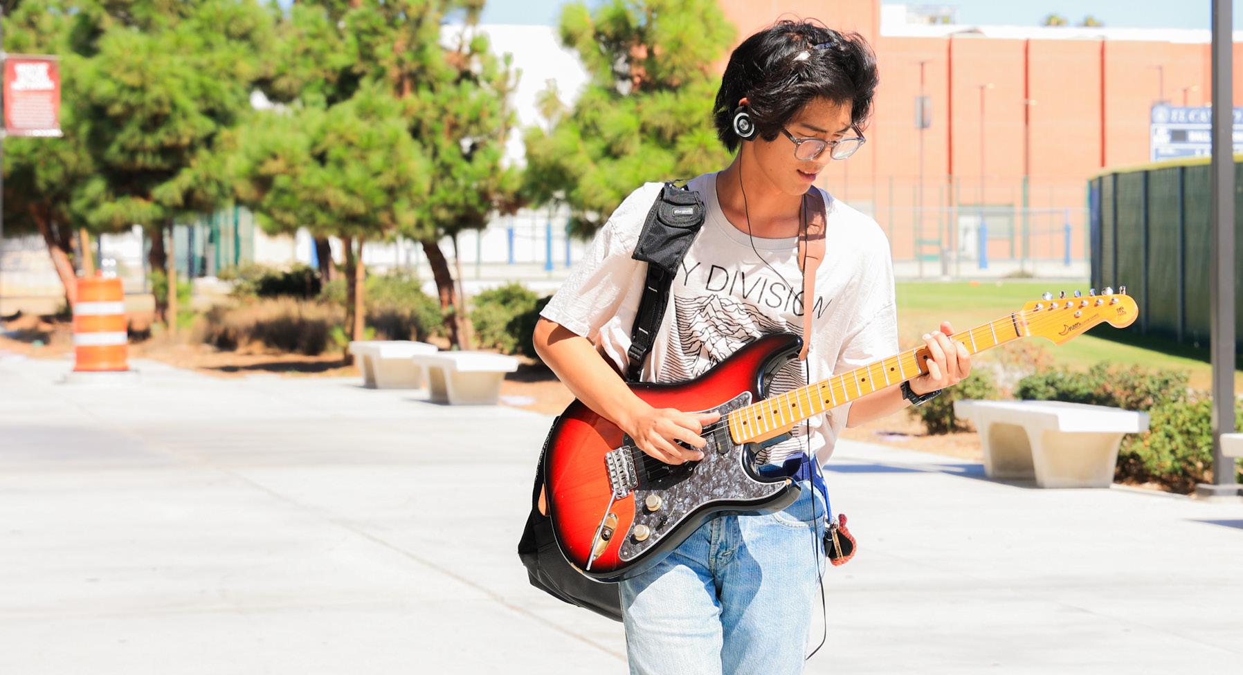 Music major Jun Ukita, 18, plays his guitar while on his way out of campus Wednesday, Sept, 3. Ukita plays guitar and bass for a local band called The Off-Keys, who covers songs from the likes of Iron Maiden, Metallica and The Cure. This five-member band, including Johnathan Diaz, Jose Reynoso, Leonardo Schmitt and Melody Garcia, plays at venues and events across the South Bay with some of their past performaces being held in San Pedro and Palos Verdes. Their first recording session dates back to 2023 and they currently have an Instagram following of over 230 people. The Off-Keys are set to perform at the Korean Bell of Friendship in San Pedro on Saturday, Nov. 1 after 5 p.m. Follow them on Instagram @the_off_keys for specific times and future performances.