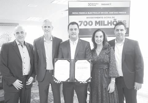 A Electrolux anunciou ontem um investimento de R$ 700 milhões para a instalação de uma fábrica 100% sustentável em São José dos Pinhais. O governador Ratinho Junior e o presidente da Electrolux América Latina, Leandro Jasiocha, assinaram o protocolo de intenções que inclui o projeto nos incentivos fiscais do Estado. A previsão é gerar 500 empregos diretos e 1,4 mil indiretos.