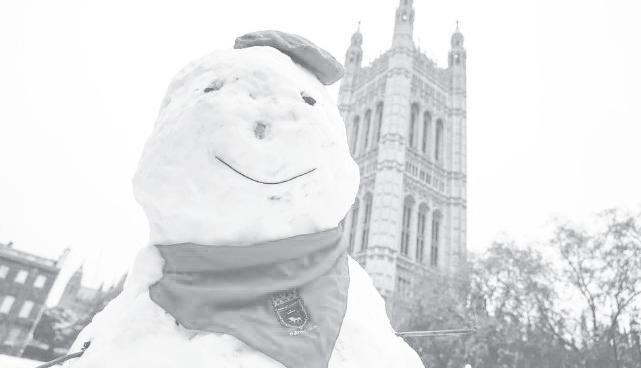 Um boneco de neve é visto em frente à torre de Westminster, em l ondres. a s temperaturas no reino Unido estão se mantendo abaixo de zero na maior parte do território, e a a gência de Segurança da Saúde do país emitiu um alerta de clima frio de nível 3, cobrindo toda a inglaterr a, até 16 de dezembro. n