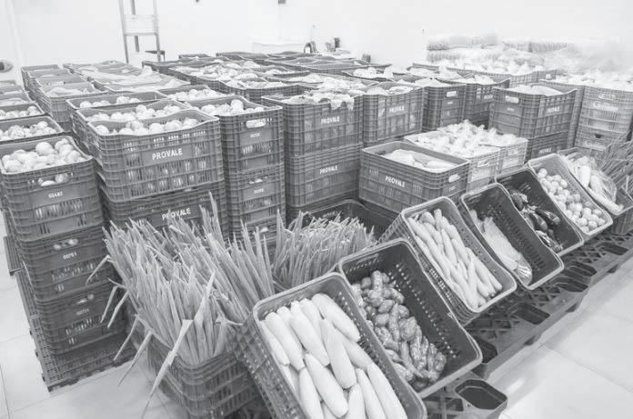 para os produtores, garantindo a distribuição eficiente dos alimentos. Os produtos adquiridos incluem mandioca e abóbora minimamente processadas e congeladas, banana, pão caseiro, doce de abóbora, polpa de fruta congelada e diversas frutas, verduras e legumes in natura. n