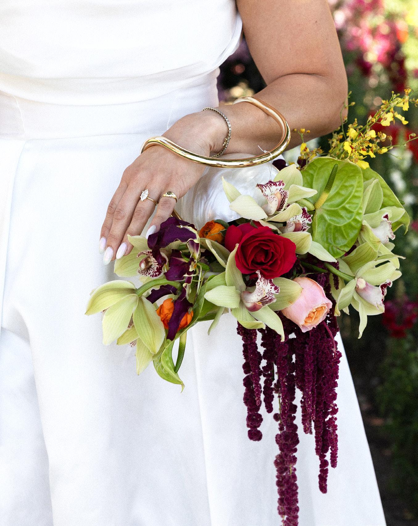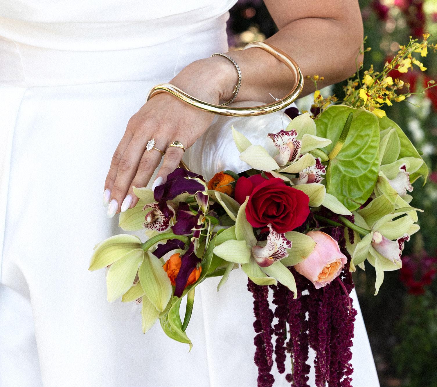 Wearable floral pieces transform flowers from simple décor into something more personal, turning blooms into accessories. What could be more beautiful than a fresh floral handbag as a bridal bouquet? This dramatic arrangement was created using a Cult Gaia pearl bag—already a piece of art in itself—but the bride envisioned adding even more drama through florals. Using luxurious blooms like Juliette garden roses, red amaranthus, green anthurium, and green cymbidium orchids, the result is absolutely breathtaking.