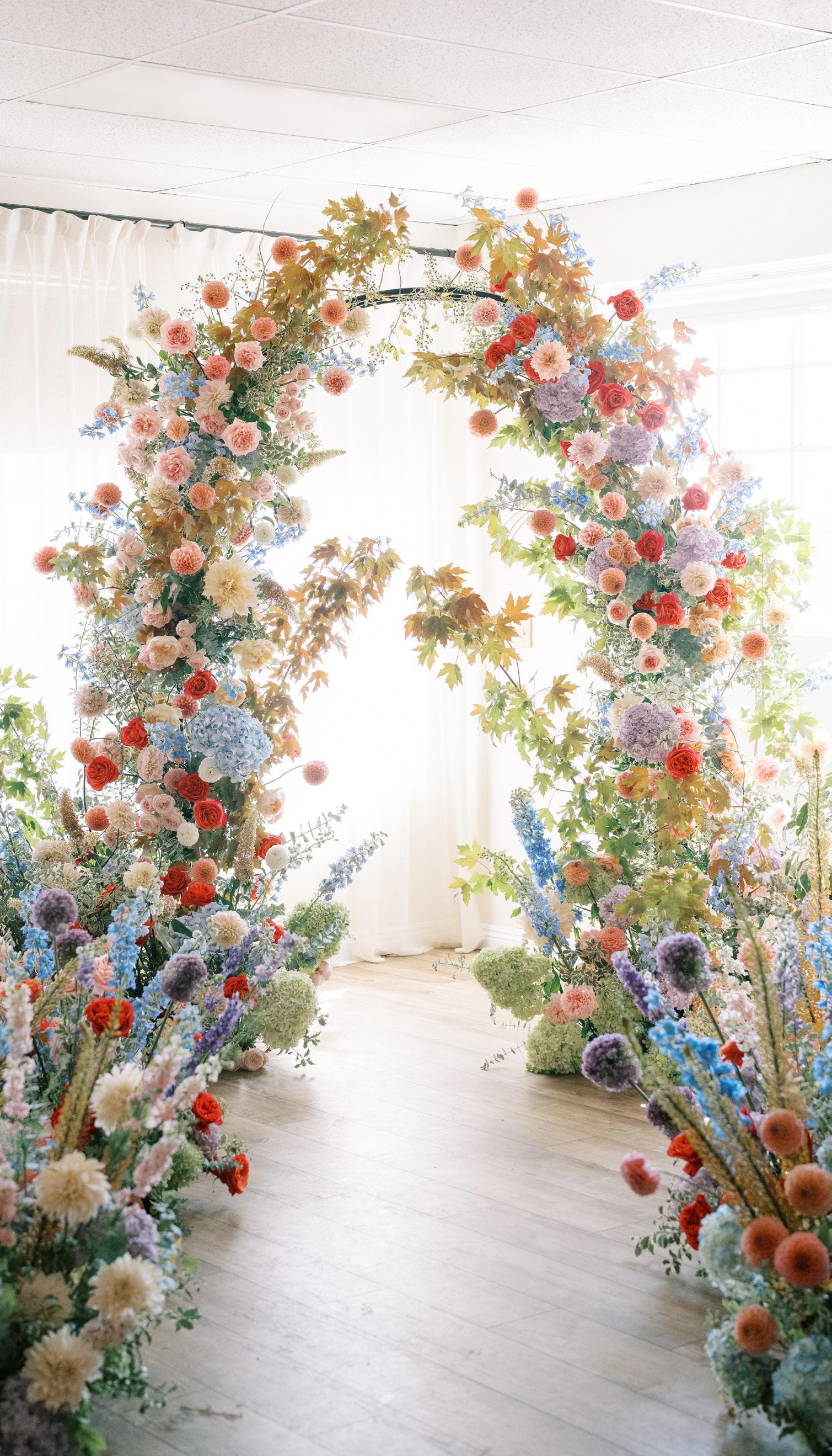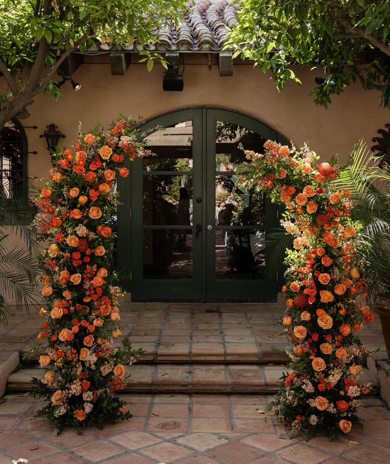 Monochromatic florals are having a major moment. Using a single color family, layered with lighter and darker variations of the same hue, defines this trend. These subtle shifts keep the design from feeling flat, instead creating depth and dimension. Bold colors are especially popular—think rich magentas, vibrant oranges, sunny yellows, and lush greens—as they deliver an elevated look without added cost when the right palette is chosen. This hacienda-inspired ceremony arch beautifully showcases shades of orange through roses, pincushion proteas, stock, ranunculus, and oncidium orchids.