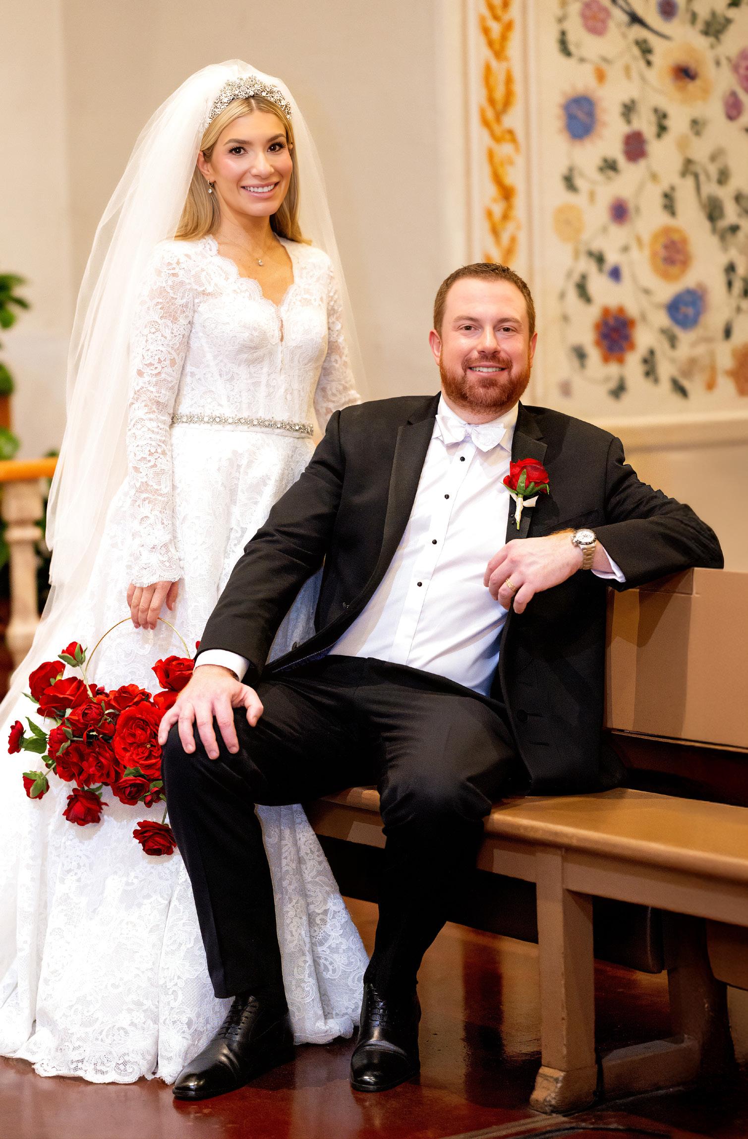Adam and the groomsmen wore tuxedos from Patrick James, then added a twist: white-and-black Air Jordans gifted to the groomsmen—and the priests, Father Rod Craig and Monsignor Rob Wenzinger. “I told everyone no Jordans at the church,” Natalya laughs. “Then the priests wore them during Mass.” Both Natalya and Adam’s wedding Rolexes came from Valley Watch Firm.