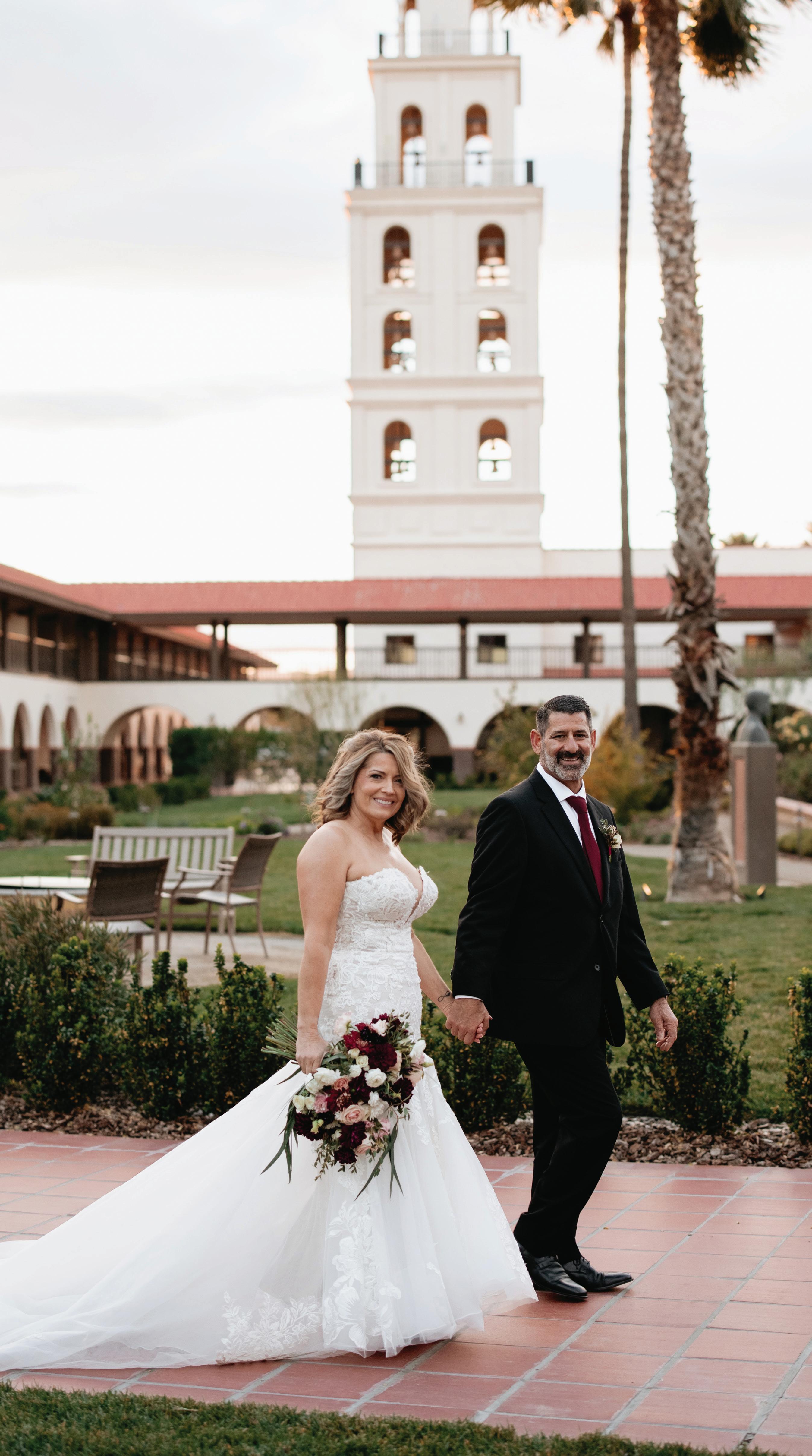 Natalya’s wedding dress and headpiece came from Kinsley Couture Bridal, with a second look by Self-Portrait. Her veil was custom-made by Joseph Jamkochian of Creative Alterations. Her cousin, Gianna Hoover—owner of Waves Salon—did her hair, while beauty prep was shared between The Spa at Fig Garden Village, CK Beauty & Aesthetics, and ME Aesthetics & Wellness.