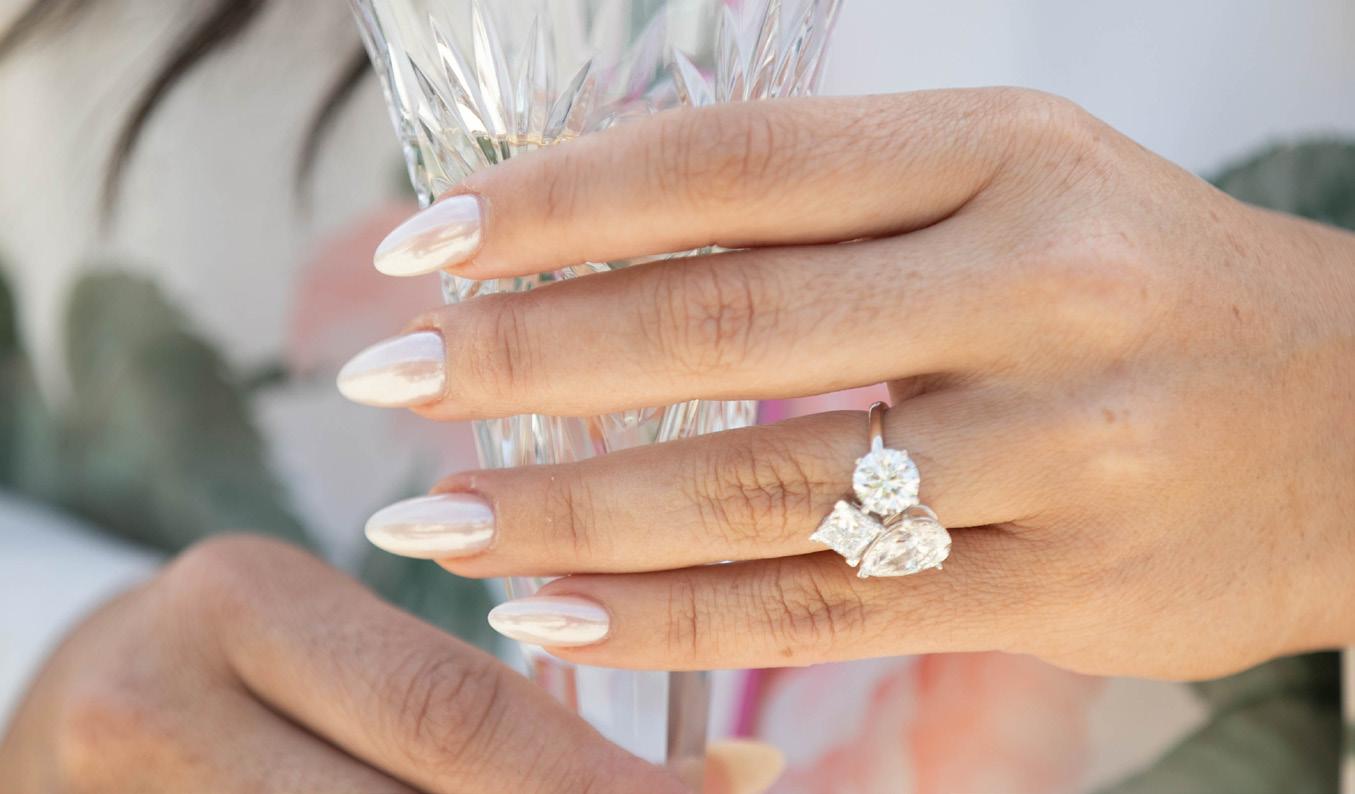 each of her bridesmaids, featuring a rose design and their birthstones at the center—Kim was later gifted the one originally made for her aunt. Still, Kimberly’s most treasured ring arrived in July 2023, when Tyson proposed. He designed the three-stone engagement ring himself, and both it and their wedding bands were crafted by Ashoori & Co. Jewelers in Visalia. Ty’s wedding band mirrors Kim’s, featuring the same three stone shapes: round, princess, and pear
