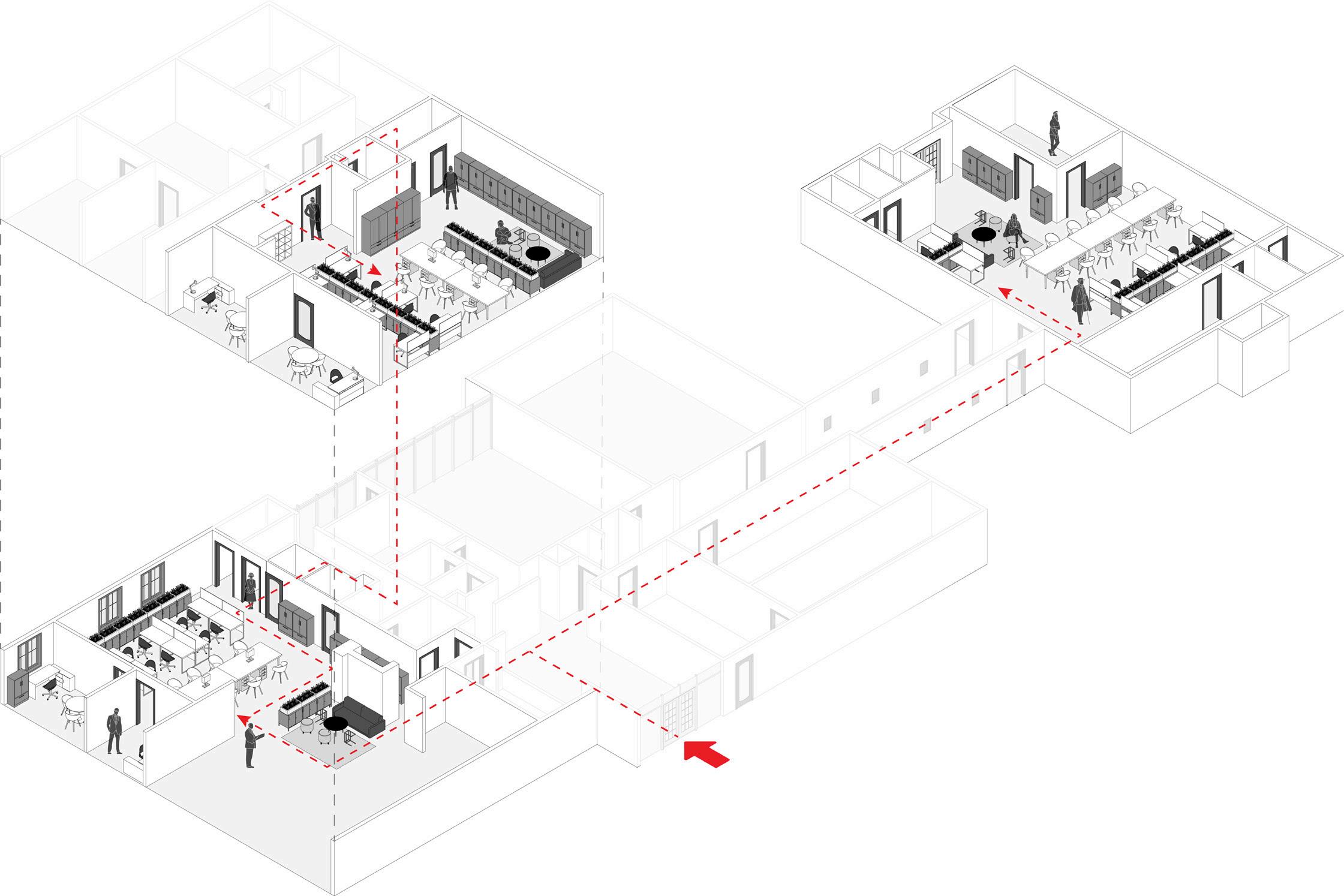 Our design concept revolves around the theme of "hybrid," creating a flexible and customized work style. We focused on redesigning the interior to better suit the needs of the five employee groups working within the facility. After conducting interviews with current employees, we designed interiors targeting specific requirements or pain points of the current design brought up by the employees.
