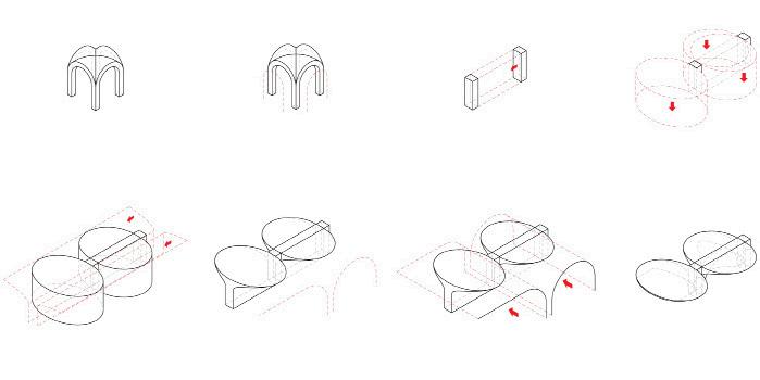 The structure of this space require six uniquely spaced columns. These columns are connected by the vaults, seamlessly transforming them from individual elements into a unified structure. This design enhances the spatial uniformity and creates an inviting atmosphere. The arches formed by the vaults are strategically placed to guide customers through the space, encouraging exploration and creating various potential pathways.