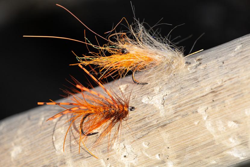 Två av Jockes havsöringsflugor. Materialvalet gör att flugan syns bra.