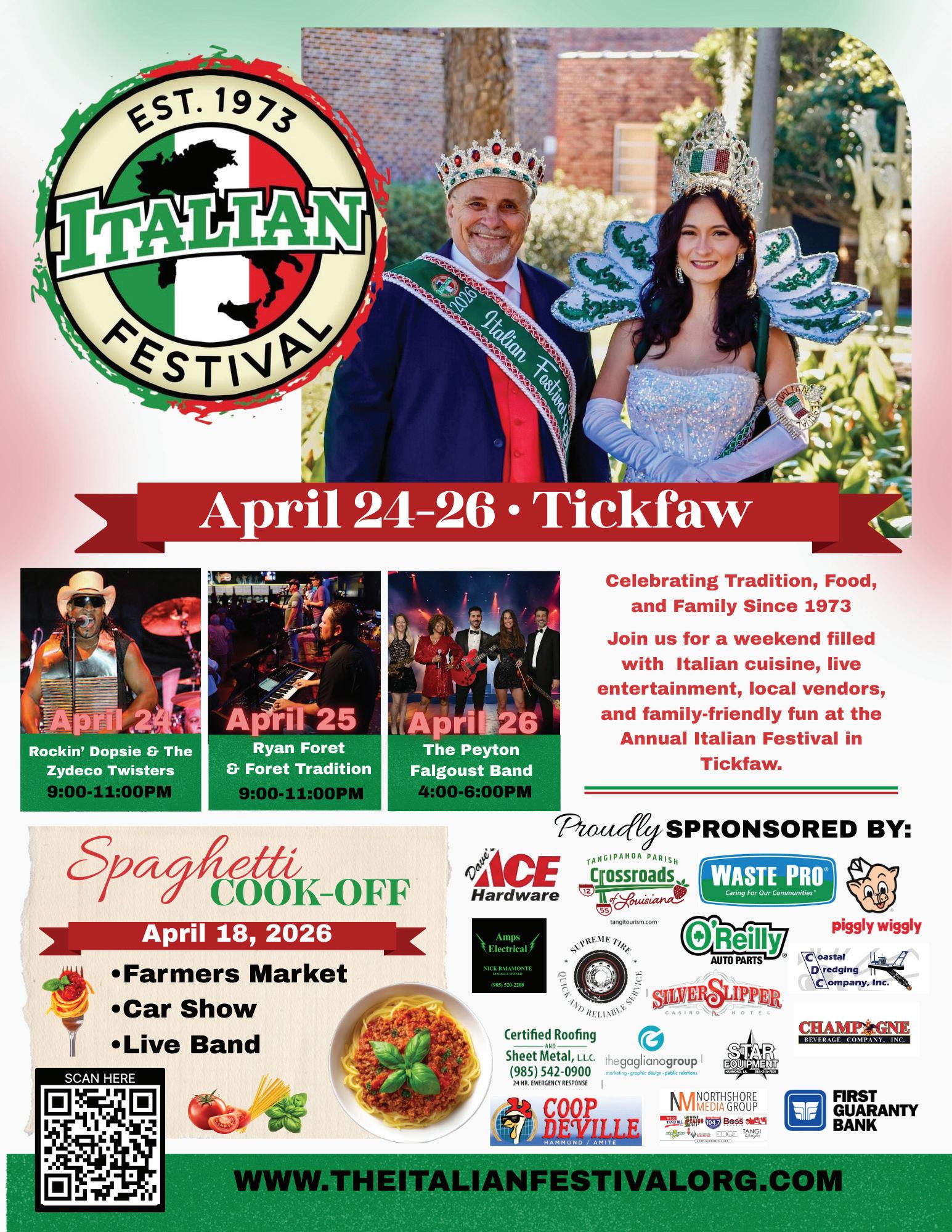 4/24-4/26 — Italian Festival 50081 Hwy 51 Tickfaw • theitalianfestivalorg.com