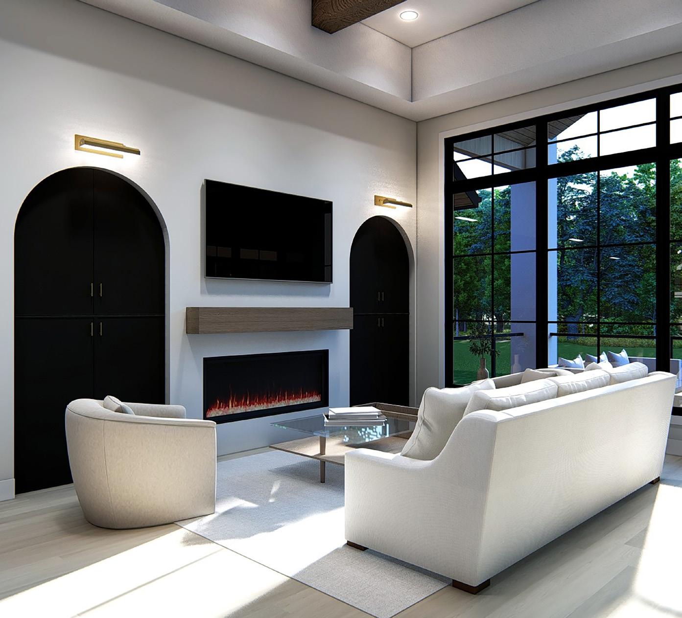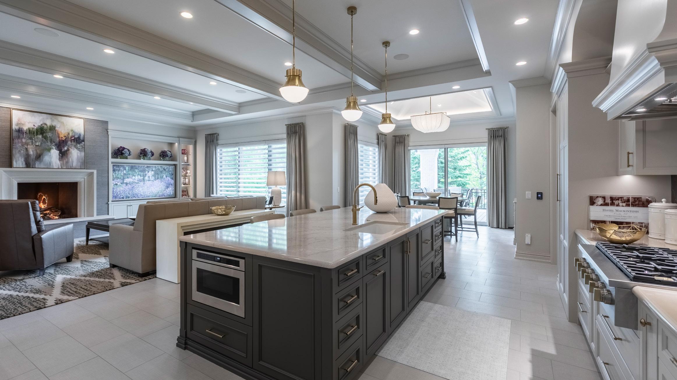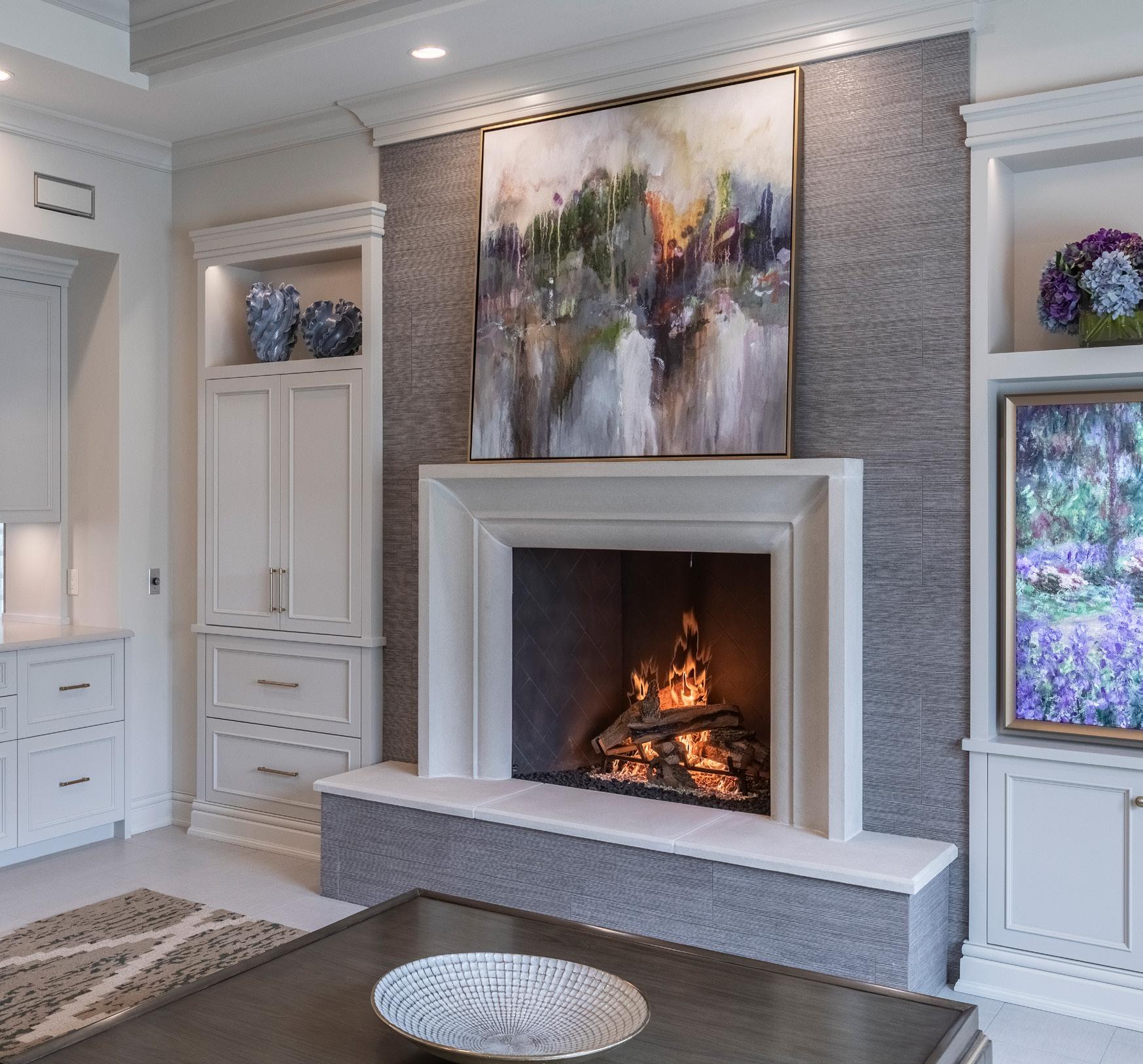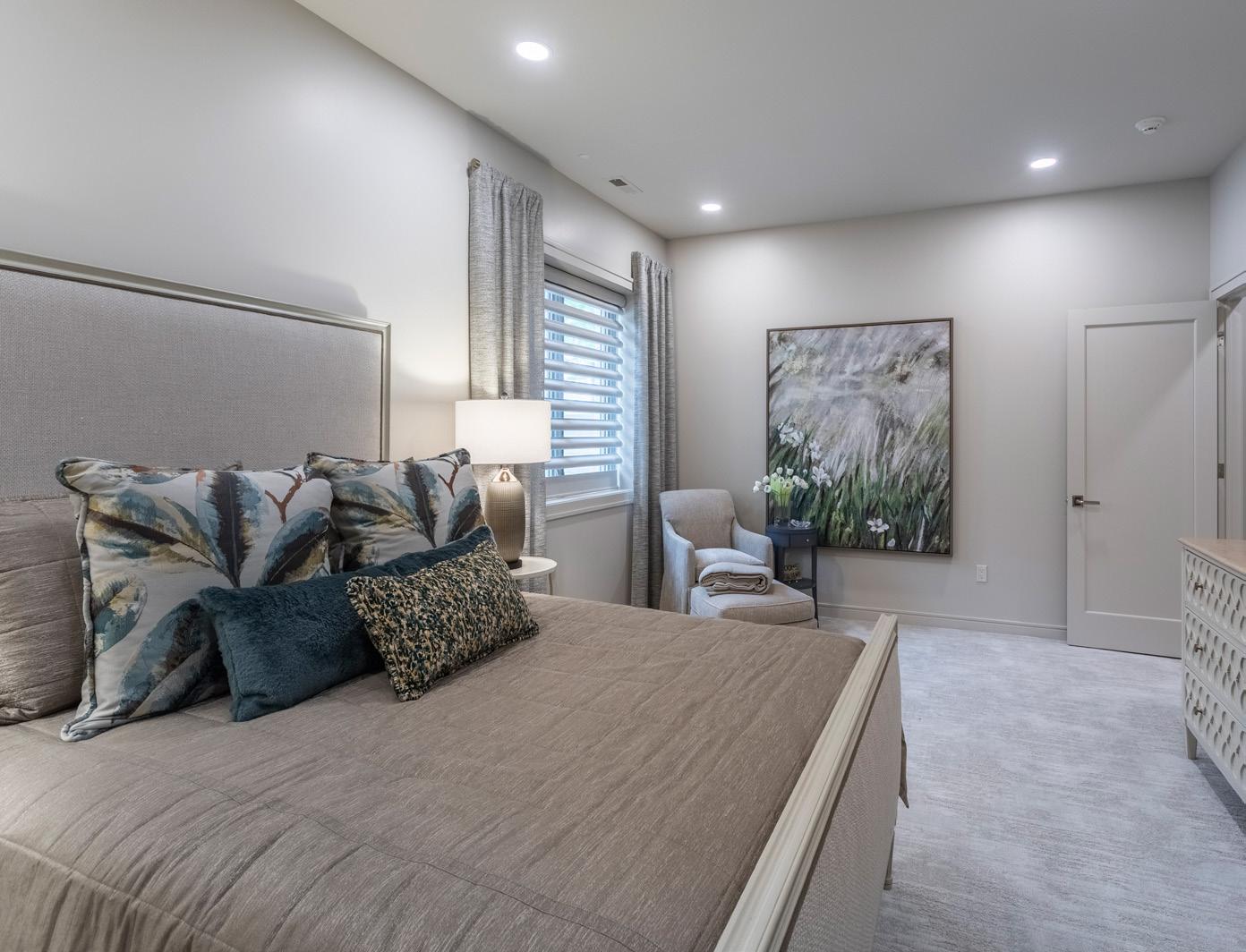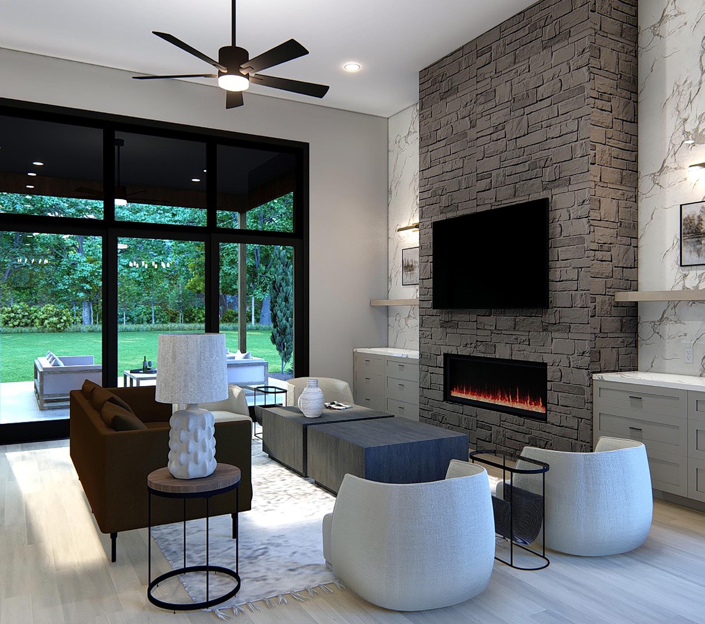 During their meetings, Patton said they discussed how this newly completed empty-nester residence would blend seamlessly with her sophisticated design from past homes with functional comfort, offering the perfect retreat for its owners. The kitchen features a dramatic center island, designer tile backsplash, and professional-grade appliances, while the adjacent great room is highlighted by a striking fireplace and an integrated media wall that adds both warmth and visual interest.