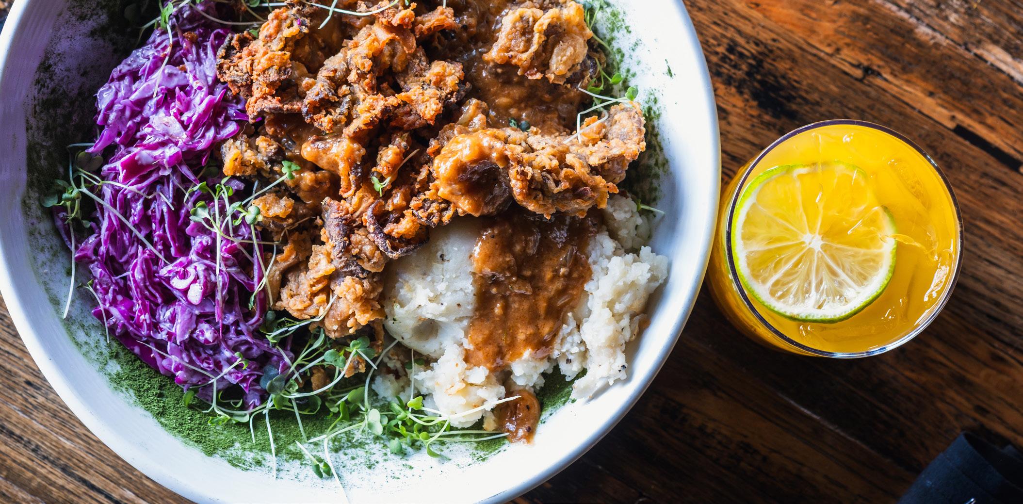 Local oyster mushrooms are battered and fried until they pull apart like actual fried chicken for the most popular Antiestablishmentucky Fried Chicken. Seitan—wheat meat pounded, simmered, and shaped into wings, burgers, pork chops, and meatballs—anchors a menu built on approachable classics like Spaghetti and Beetballs and Not-Your-Mom’s Meatloaf. Add a brown onion gravy with creamy mashed potatoes, coleslaw, and flaky, layered biscuits and butter that are made in-house (coconut oil, olive oil, oat milk, and salt), and you’ll have to check your location to remember you’re not sitting in a deep-fried Southern establishment with all the fixins.