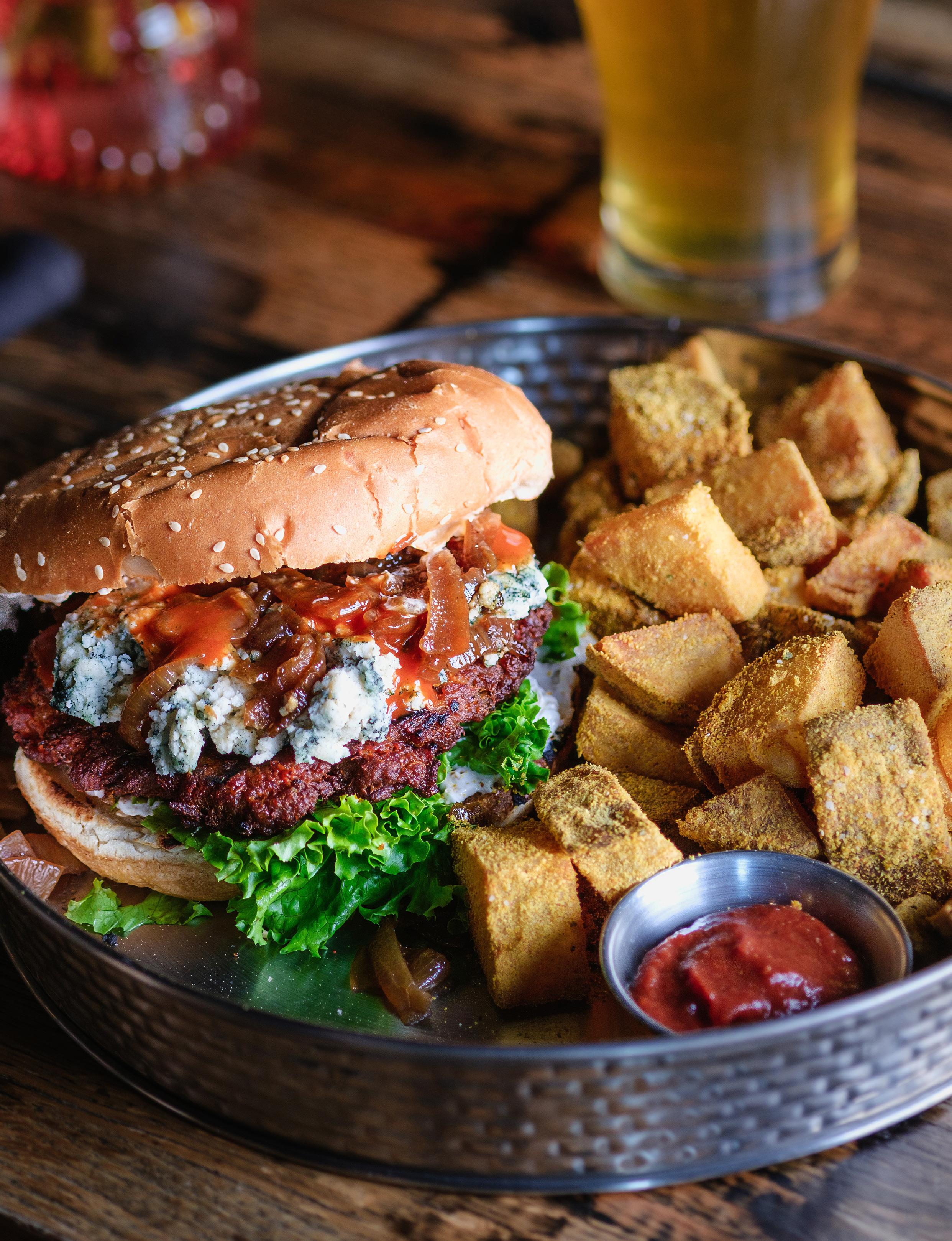 ALMOND “BLUE” CHEESE BUFFALO BURGER WITH POTATO FRIES
