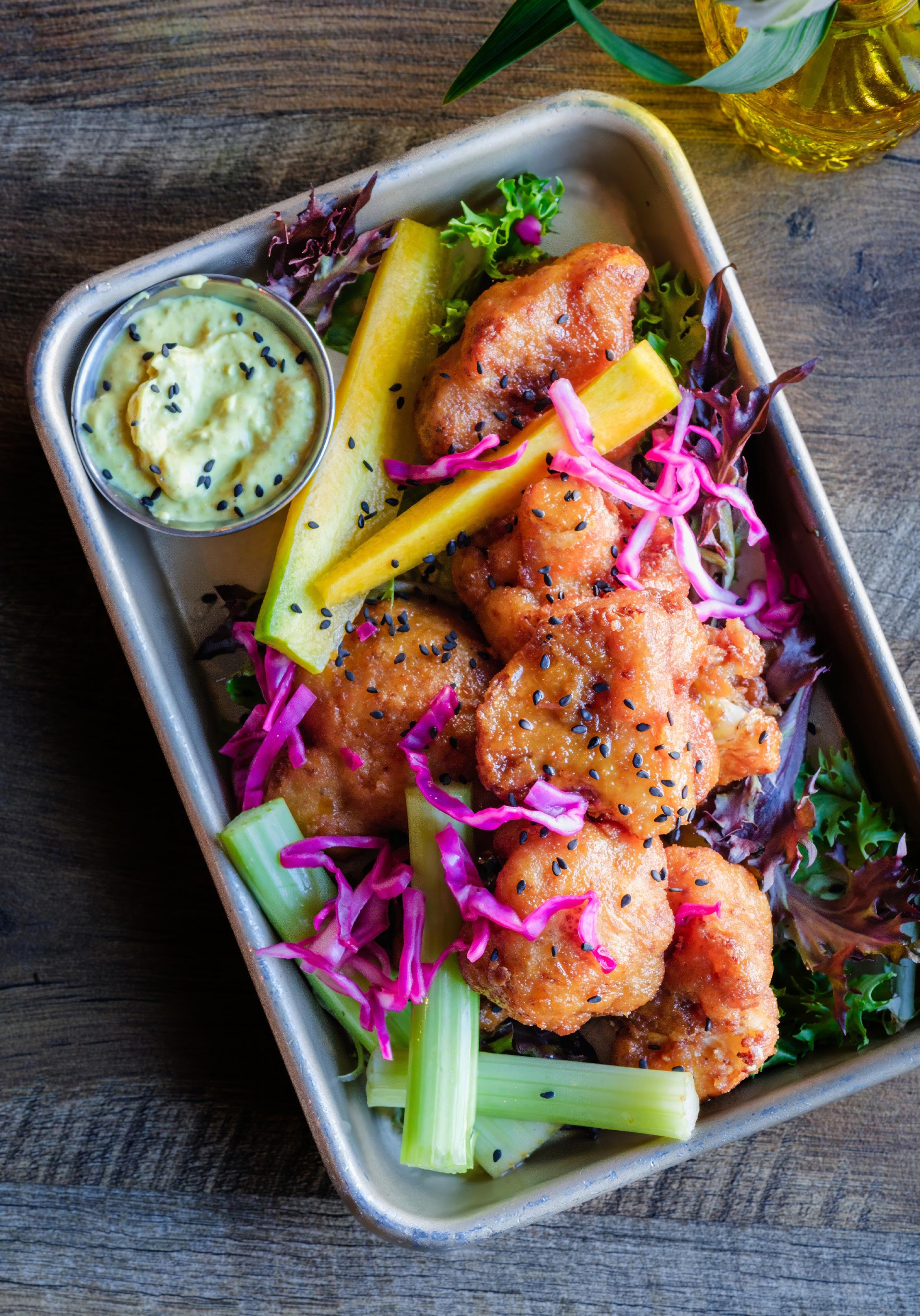 CAULIFLOWER BUFFALO WINGS WITH CURRY MAYO