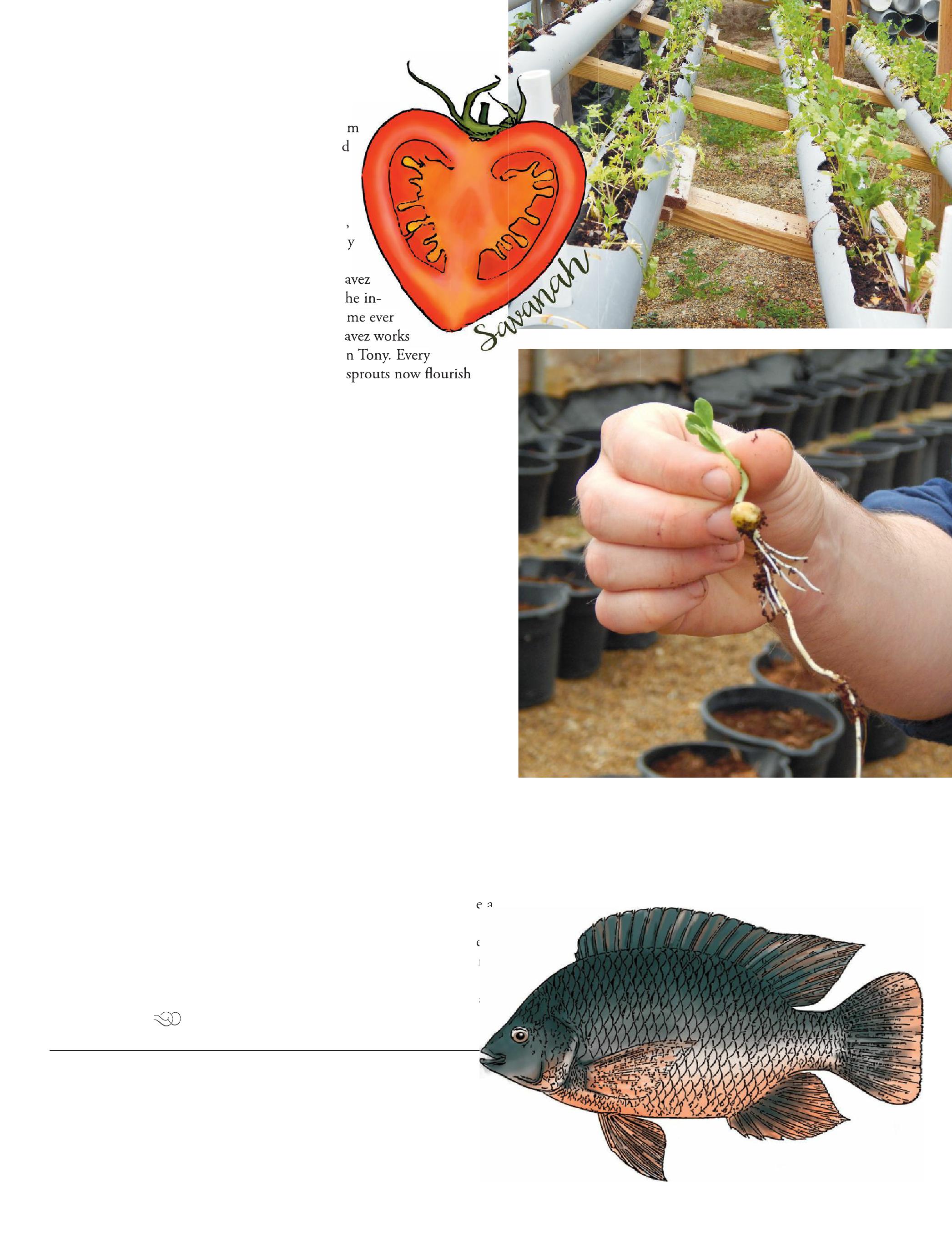 As the brilliant and curious mind of Sam Chav digs deeper into what makes living things tick, th novative growing systems at Savanah Farms becom more sophisticated and the off erings expand. Chav on the farm almost every day, often alongside son y y imaginable herb, plus kale, chard and sunfl ower sprouts now flourish in the greenhouse, alongside Sam’s proudest accomplishment to date: a heart-shaped Roma-F1 tomato hybrid, named, of course, the Savanah. Th e seedlings are nurtured in shredded coconut hair in an intricate vertical maze of fi eld tiles that have watering tubes running underneath and strategically drilled drainage holes to create optimal water levels. And the water comes not from the city supply, but from 11 rain barrels on site, which hold a total of 5,000 gallons of water.