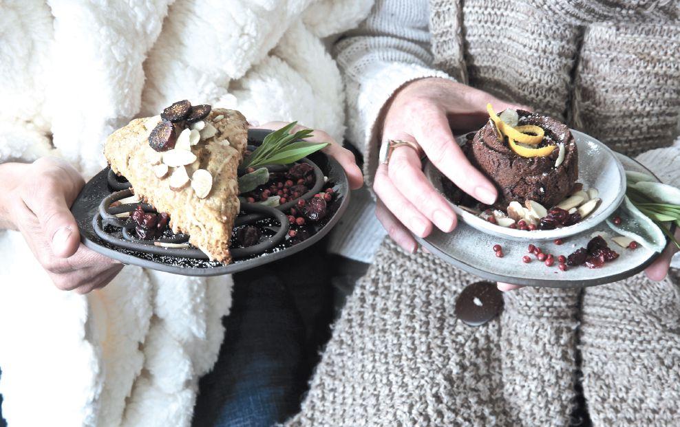 ½ cup all-purpose flour ¾ cup + 2 tablespoons cake flour ¼ cup smoked almond flour 1½ teaspoons baking powder 2 teaspoons baking soda 2 tablespoons brown sugar 1 tablespoon dried apple 2½ tablespoons maple syrup 1 teaspoon salt ½ cup + 1½ tablespoons coconut oil (grated) ¼ cup + 1 tablespoon oat milk (plus extra for baking) 2 tablespoons Almond Bite Liqueur ¼ cup + 3 tablespoons almond yogurt 2 tablespoons grated apple Sanding sugar or chunkier sugar (for garnish) Preheat oven to 350°F. Measure all ingredients and have everything close by. Sift flours with baking powder and baking soda. Add salt and brown sugar. Mix to combine. Add dried apples. Mix together wet ingredients (almond yogurt, almond liqueur, oat milk, grated apple and maple). Mix the cold grated coconut oil into the flour mixture. Don’t work it too much— you want there to be some pea-sized pieces of the coconut oil scattered throughout. Add the wet ingredients to the flour mixture. Use your hand to mix well. The colder everything is, the better this will work. Do not work the mixture into a smooth dough. There should still be pieces of coconut oil scattered throughout. Working the dough too much will make the scones too dense. Once your dough is holding together, turn out onto a floured table. Press the dough with your hands into a circle that is approximately 1½ to 2 inches tall. Flatten out the top. Cut into desired shape. Triangles are always good or try circles, squares or even Christmas trees. Place on parchment- or Silpat-lined pan and brush each scone with a light swath of oat milk. If you have sanding sugar or chunkier sugar, sprinkle it on for extra crunch. Bake the scones for 20 minutes, or until they start to brown on the top and are fairly firm to the touch. Let cool slightly before eating.