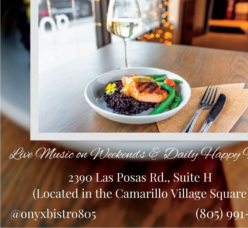 Woman owned and operated, serving a casual but re ned seasonal menu made with locally sourced ingredients and paired with local craft beer and wine. Indoor and outdoor seating, live music on weekends, and brunch o ered Sundays. 2390 Las Posas Rd. Suite H | Camarillo 805-991-7356 | onyxbistrocamarillo.com