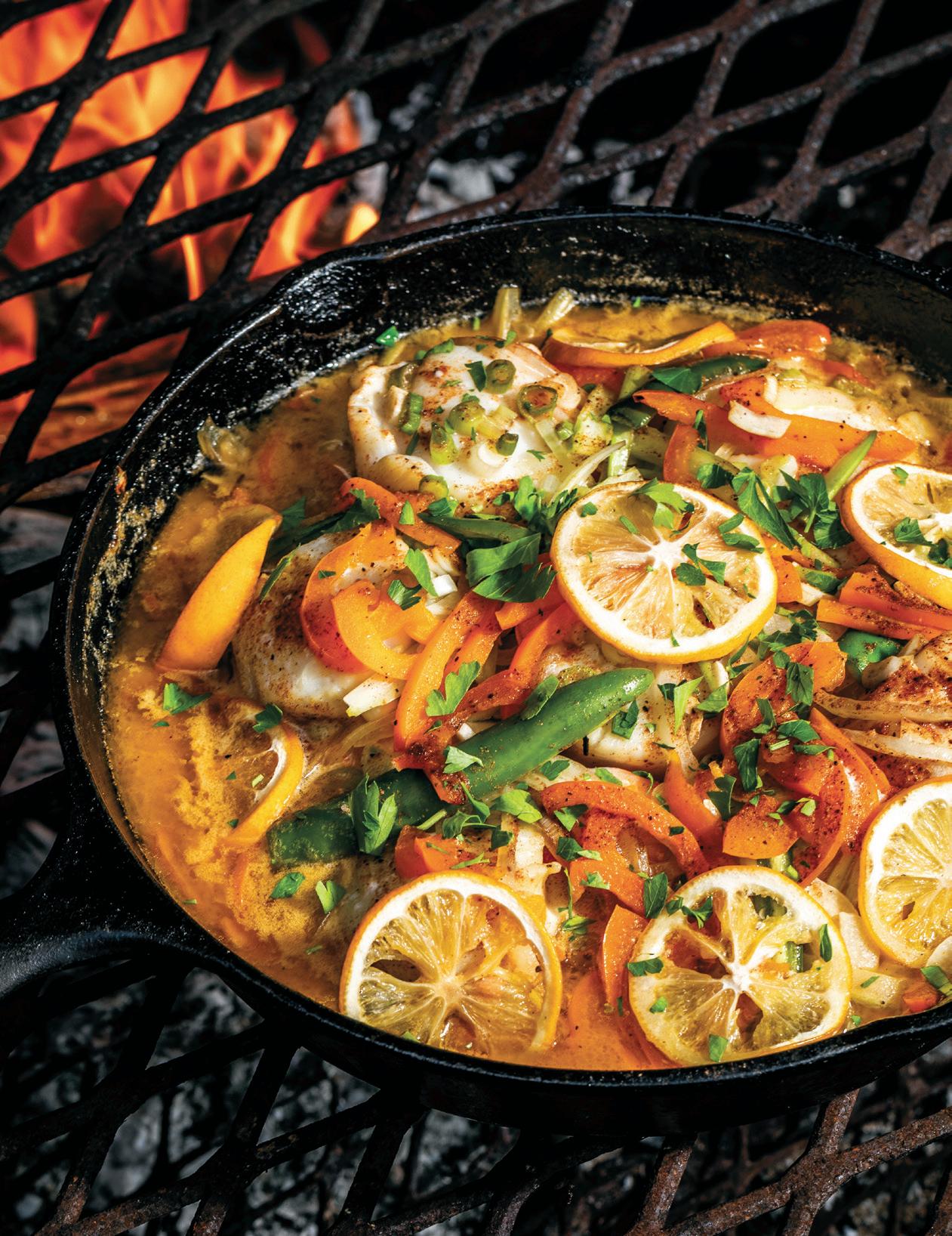 Cover the skillet with foil and finish cooking until the fish has reached about 140−145° F and the juices from the seafood and veggies have rendered, approximately 10 minutes. About halfway through, make sure to rotate the skillet.