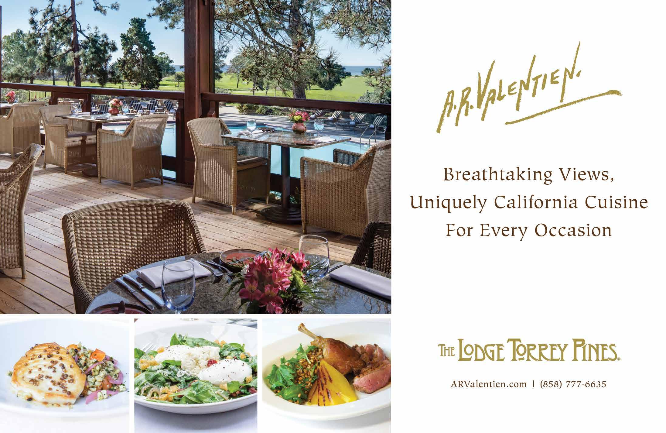 The Torrey Pines Lodge’s signature restaurant, A.R. Valentien, highlights regional San Diego cuisine served in an elegant, timbered indooroutdoor dining room overlooking the 18th hole of Torrey Pines Golf Course. Executive chef Jeff Jackson sources only the best local provisions, and the menu changes frequently based on seasonal fare available. The restaurant takes its name from a talented early-20th-century California artist whose works are exhibited throughout the restaurant.