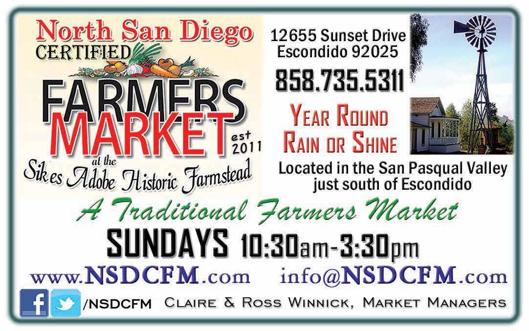 Valley Center 28246 Lilac Rd. 3–7pm (2–6pm, Nov to Mar) vccountryfarmersmarket@gmail.com