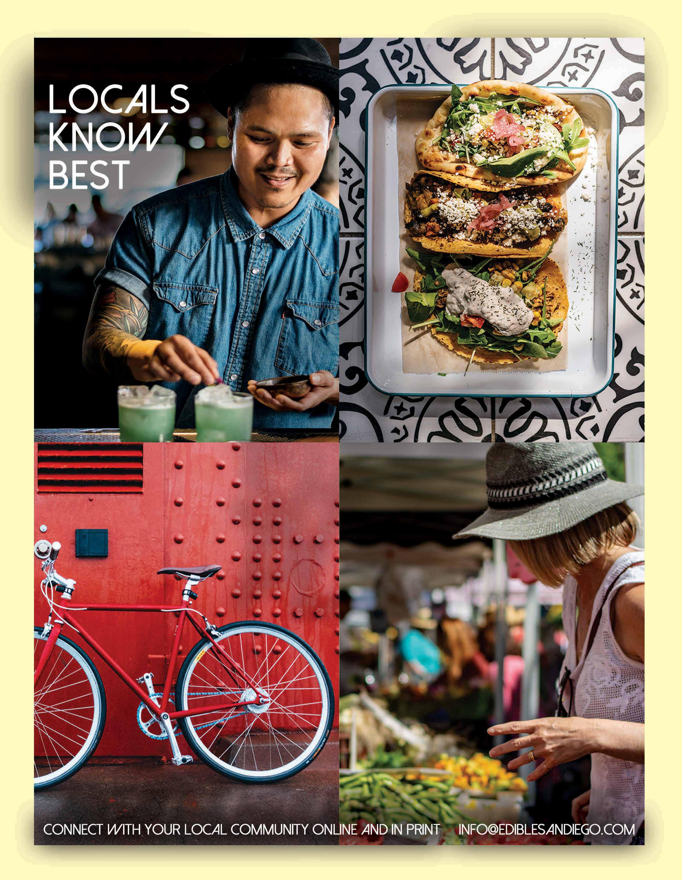 We hope you will take us with you this summer—whether that means tucking this issue in your beach bag or hanging out with us online. Here’s a little nugget to keep in mind as you enjoy our content. In many ways, Edible San Diego resembles the small businesses we celebrate, consciously choosing to create a quality product even though it’s more expensive to do things locally, by hand, with the best inputs and talented people who are in it for the greater good. We’re a media company in a new era where ev eryone can create content or aspire to be an influencer. Old rules and roles of communications evolve fast as people who produce, prepare, sell, research, write about, and eat food (yes, that means all of us) seek viability and meaning in a globalized world.