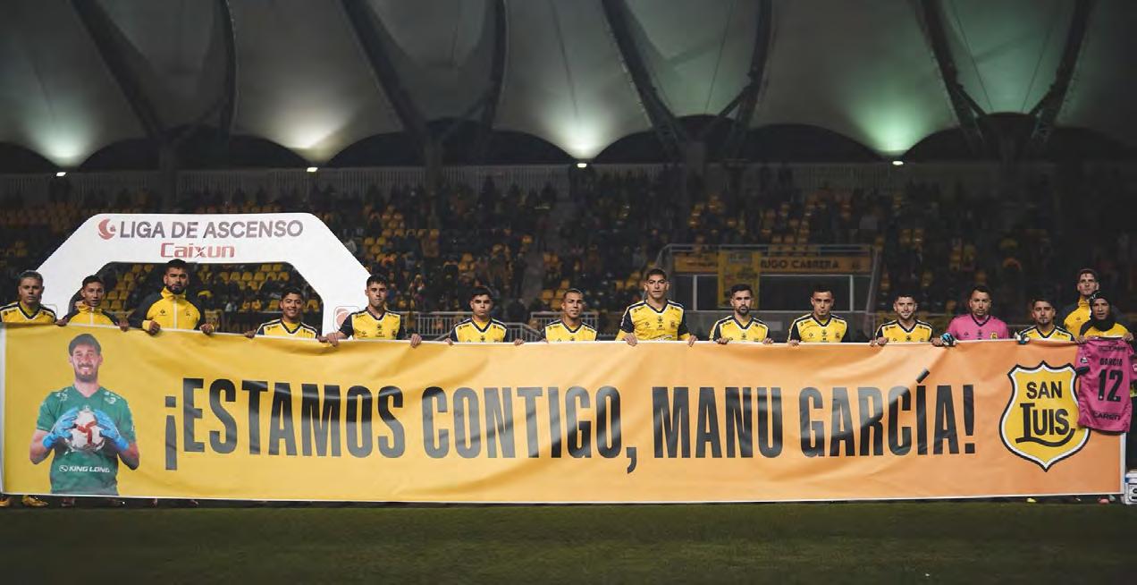 En una emotiva muestra de respaldo, los jugadores de San Luis ingresaron al terreno de juego portando un lienzo con el mensaje: “Estamos contigo ‘Manu’ García”, gesto que fue destacado tanto por la hinchada como por los medios presentes en el estadio.