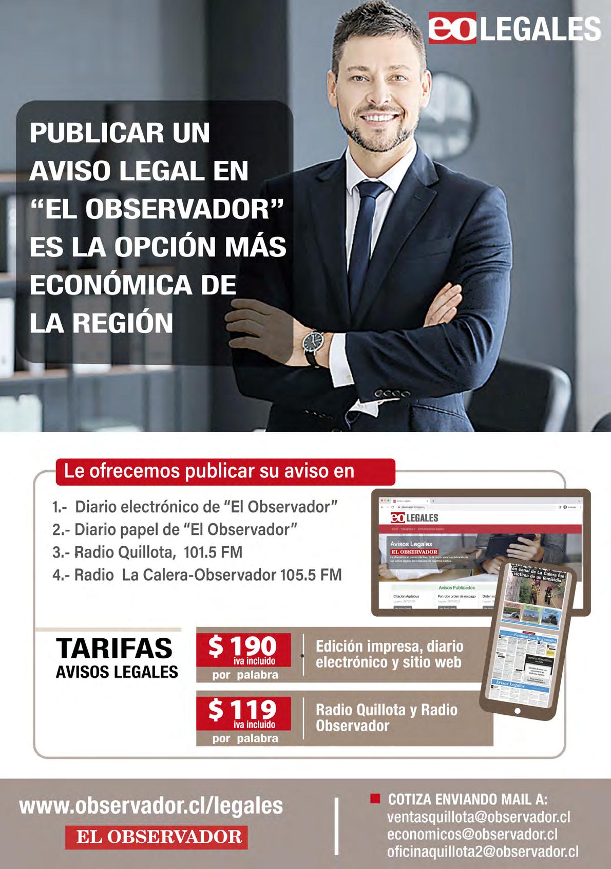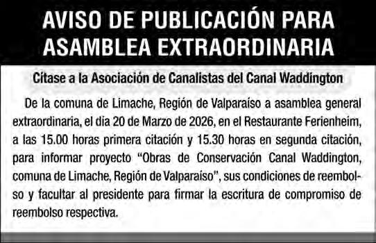 ESTADO, PARA LA EVENTUAL SUSCRIPCIÓN DE LA PERTINENTE ACTA DE REMATE. ASIMISMO, A EXCEPCI Ó N DEL EJECUTANTE, DEBERÁ RENDIR CAUCIÓN SUFICIENTE POR CITACIÓN: LA Cooperativa de Servicio de Agua Potable De Americana Ltda. Cita a sus socios(as) a Asamblea General, para el día Domingo 15 de Marzo de 2026, a las 11:00 horas en primera citación y 11:30 horas en segunda citación. Lugar Sede Cooperativa ubicada en Pasaje Mena Nº55 Petorquita, Hijuelas. Tabla: Palabras de bienvenida. Lectura Acta Anterior. Estado Contable (balance 2025). Varios. NOTA: La NO asistencia a reunión tendrá una multa de $5.000. CONSEJO ADMINISTRATIVO.