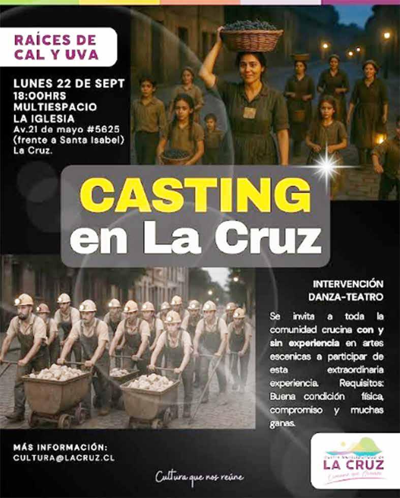 En el marco del aniversario comunal, la Municipalidad de La Cruz lanzó una invitación abierta a toda la comunidad para sumarse al casting de la obra de teatro urbano “Raíces de Cal y Uva”, una in tervención de dan za-teatro que busca poner en escena la historia y el patri monio local.