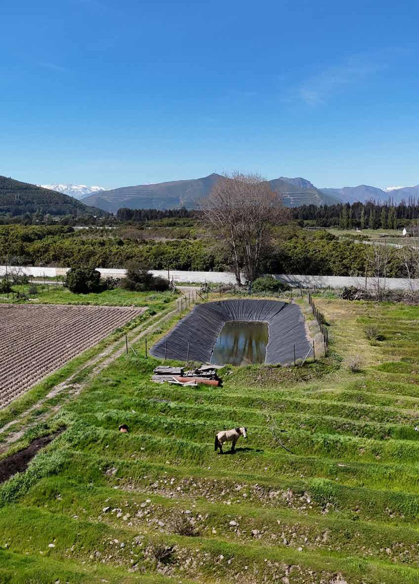 Dronero Es mediodía y este caballo disfruta solitariamente de un día más del mes patrio. Un poco más lejos, un estanque de agua muestra el reflejo de un árbol a la distancia. Romeral.