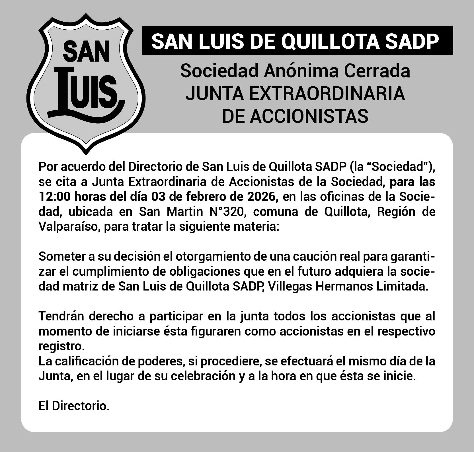 CITACION SEÑOR(A) Accionista: La Asociación Canal de Mauco cita a la Asamblea General de Accionistas a efectuarse el día Viernes 23 de enero de 2026 en el Centro de Eventos Casona de Boco, ubicada en el Fundo El Mirador Boco - Quillota, siendo la primera citación a las 10:30 hrs. y en segunda citación a las 11:00 hrs, formándose sala en este último caso con las personas que se encuentren presentes. TABLA: 1.- Lectura acta anterior 2.- Trabajos efectuados durante el año 2025 3.- Balance año 2025 4 - Presupuesto año 2026 5Fijación de cuotas año 2026 6.- Elección de Directorio 7.Designación de los Revisores de Cuentas 8.- Varios. Poder para reducir a Escritura Pública los acuerdos que se tomen en dicha asamblea, “solo tendrán