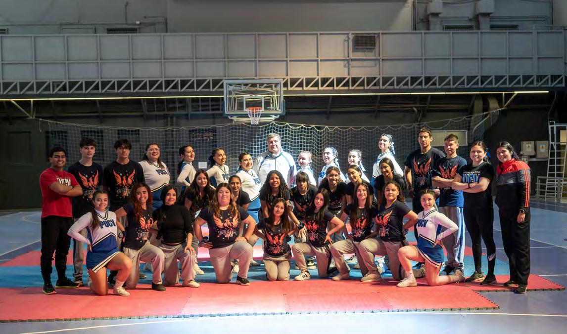 Los equipos de cheerleading femeninos "PUCV Splash" y "PUCV Bubble" entrenan dos veces por semana entre el renovado gimnasio de la Casa Central y el Campus Sausalito, donde llevan al tapete sus habilidades y destrezas para realizar giros por los aires y dar saltos continuos a lo largo y ancho de la cancha.