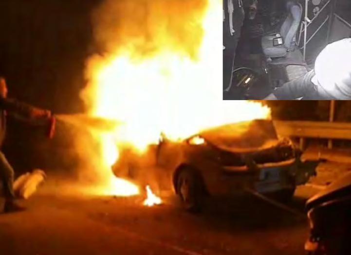 Producto de esta colisión de alta energía, uno de los vehículos chocó con la barrera de contención; mientras que el vehículo blanco comenzó a incendiarse con sus cuatro ocupantes en el interior.