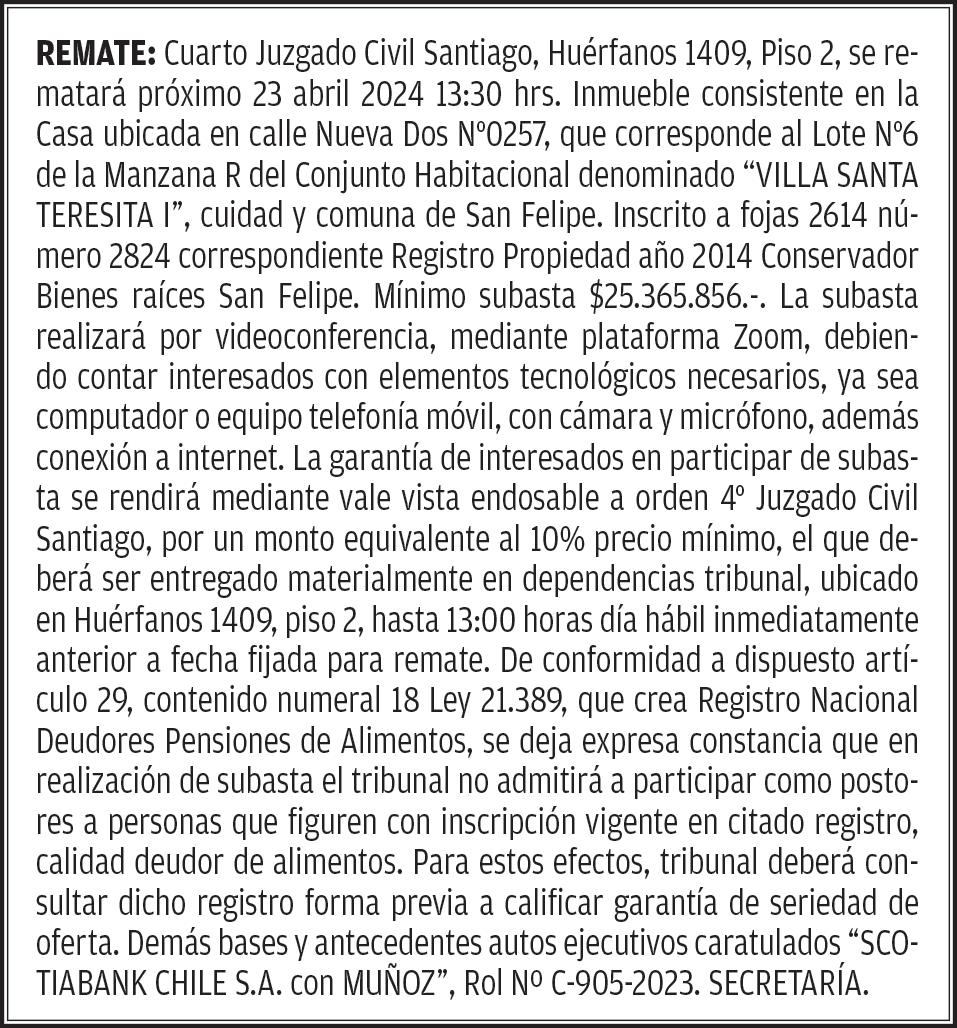 E X T R A C T O. Juzgado de Letras de La Ligua, en causa rol V-449-2023, mediante sentencia firme y ejecutoriada de fecha 02-Ene-2024, SE CONCEDE, CON BENEFICIO DE INVENTARIO, LA POSESIÓN EFECTIVA DE LA HERENCIA TESTADA quedada al fallecimiento de ELIA ROSA