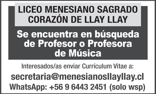 COLEGIO CATÓLICO de Nogales necesita docente de Lenguaje, orientación y Electivo arquitectura. Enviar antecedentes a correo curriculum@ fundacioncsi.cl.