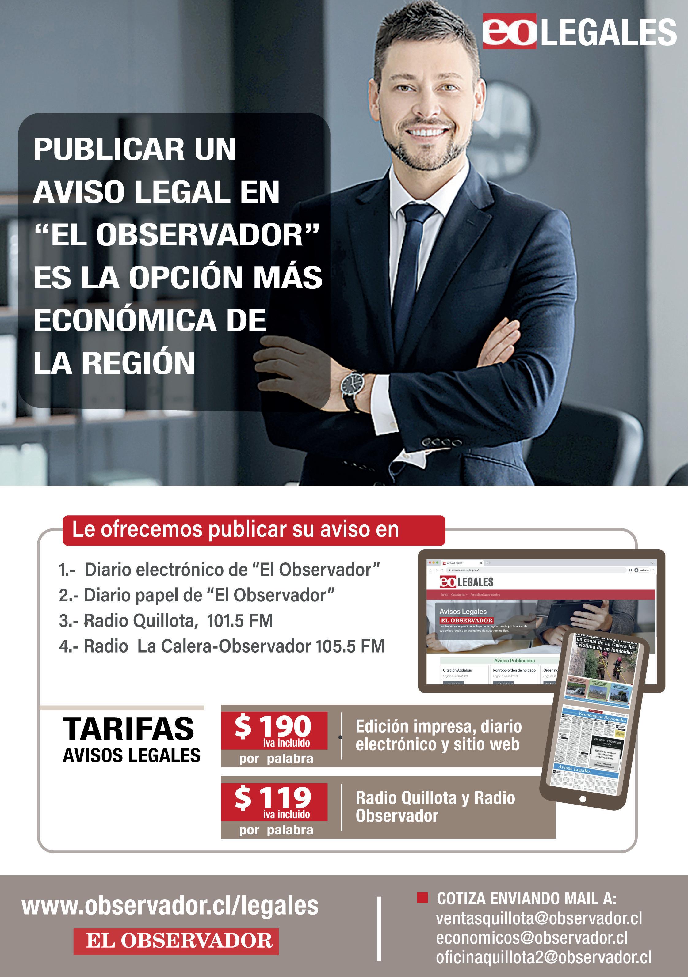 Publica tu aviso clasificado escribiéndonos a: economicos@observador.cl