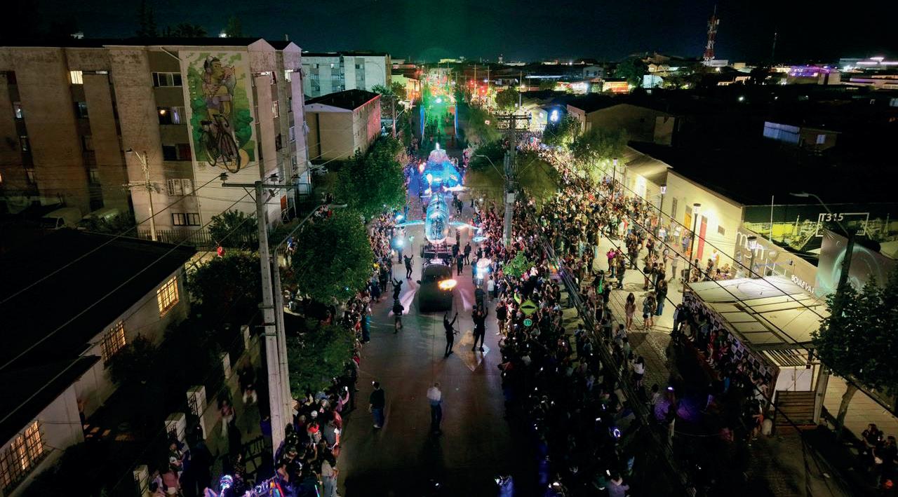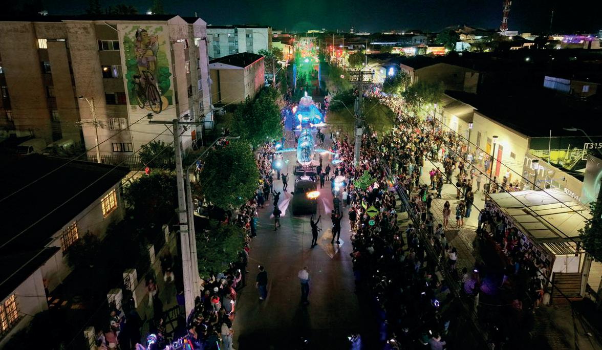las 21:30 horas y transformó el espacio público en un océano de luces, colores y figuras marinas, incluyendo una imponente ballena jorobada y peces luminosos que recorrieron las principales arterias de la ciudad.