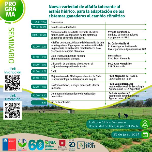 El seminario ofrecerá tres interesantes exposiciones internacionales y cuatro nacionales, a cargo de reconocidos investigadores y asesores: los doctores Luis Inostroza, Alejandro del Pozo y Carlos Ovalle además de la investigadora transferencista Viviana Barahona. Asimismo, contará con la participación de iniciativas internacionales que han colaborado en la búsqueda de parientes silvestres de la especie, con las presentaciones de Alan Humphries de SARDI Australia, Luis Salazar de Crop Trust Alemania y Daniel Basigalup de INTA Argentina. Estos siete especialistas, líderes de la industria de este recurso forrajero, se darán cita en el Auditorio del Edificio Bicentenario de la Universidad de Talca, Región del Maule, para dar vida al seminario “Nueva variedad de alfalfa tolerante al estrés hídrico para la adaptación de los sistemas ganaderos al cambio climático”.