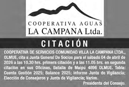 CITACIÓN SEÑORES accionistas: El Directorio de la Asociación de Canalistas Sociedad del Canal de San Pedro, cita a usted a la Junta General Ordinaria de Accionistas, para el jueves 26 de marzo de 2026, a las 17:00 horas, en primera citación y a las 17:30 horas, en segunda citación, formándose sala en este último caso con las personas que asistan, en el Liceo Agrícola Profesor Víctor Olguín Morales, Troncal Paradero 3 de Quillota. Tabla: 1.- Lectura acta anterior. 1.- Balance y Memoria año 2025. 3.Situación Financiera. 4.- Elección de Directorio. 5.- Revisores de Cuentas. 6.- Varios. El Directorio.