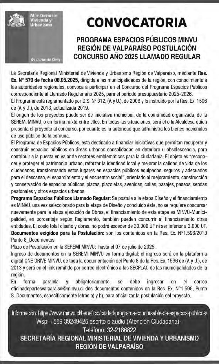 Informamos a nuestros lectores que en la edición del DIARIO ELECTRÓNICO del próximo lunes 16, se publicarán los avisos legales ordenados por Bienes Nacionales, correspondiente a la primera publicación del 15 de Junio 2025. Además, podrá encontrar en nuestro sitio www.observador.cl en forma gratuita las ediciones de nuestro diario electrónico y un banner de Seremi de Bienes Nacionales, Región Valparaíso, donde quedarán alojados en un historial por fechas.