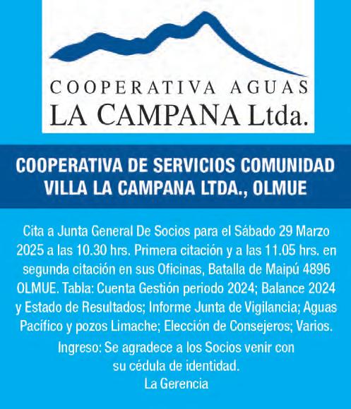 ral Ordinaria de Accionistas, para el jueves 27 de marzo de 2025, a las 17:00 horas, en primera citación y a las 17:30 horas, en segunda citación, formándose sala en este último caso con las personas que asistan, en el Liceo Agrícola Profesor Víctor Olguín Morales, Troncal Paradero 3 de Quillota. Tabla: Lectura acta anterior. Blance y Memoria año 2024. Situación Financiera. Elección de Directorio. Revisores de Cuentas. Varios. El Directorio.