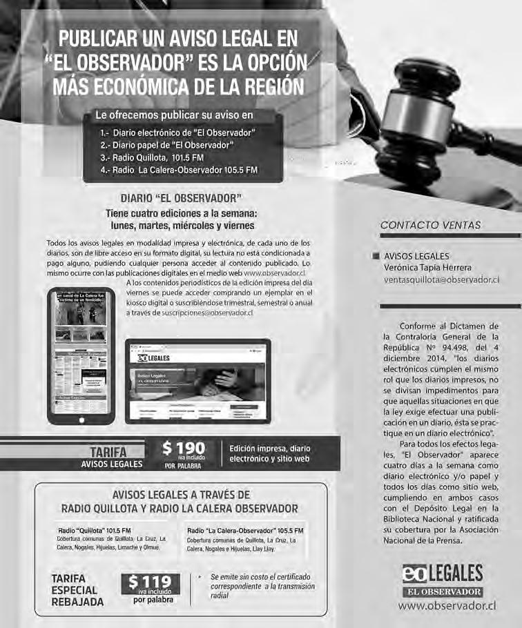 Coordinadora Comercial: Verónica Tapia Herrera ventasquillota@observador.cl Fono: +56 9 8887 9747 - Casa Matriz - Quillota