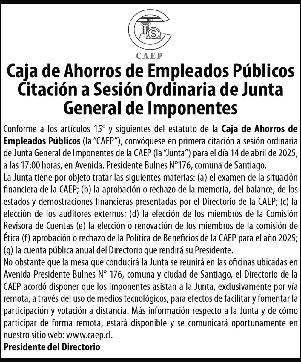 LA COMUNIDAD de Aguas Canal Rauten cita a su Asamblea General Ordinaria de Accionistas a efectuarse el sábado 12 de abril de 2025, en la sede comunitaria de Rautén