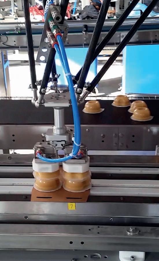 En función de la capacidad de cada línea de envasado y patrón de paletizado que se desee, las células tienen tres o cuatro alimentaciones de productos, lo que garantiza una tasa de utilización del robot del 92 por ciento.