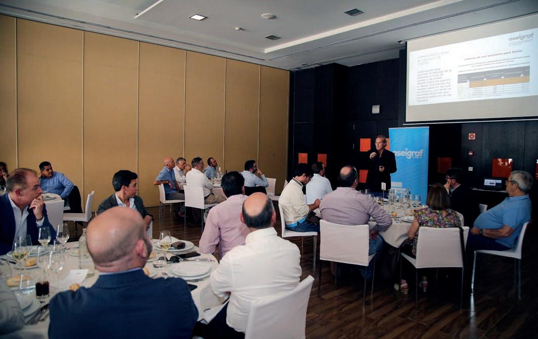 niendo de relevancia la unión de las empresas y las ventajas del asociacionismo. Enrique López, presidente de Aseigraf, fue el encargado de dirigirse a las empresas asistentes y aprovechó la ocasión para poner en valor algunos de los servicios y actividades más importantes de la Asociación: la Herramienta para el cálculo de costes realizada para todos los asociados que es de gran ayuda para conocer la realidad de la empresa a nivel de costes y así poder decidir sobre los precios a ofertar conociendo los costes reales en los que se incurre; la Marca registrada Producto Gráfico Andaluz Sostenible que se creó para dar valor al producto gráfico andaluz, unificando el origen,