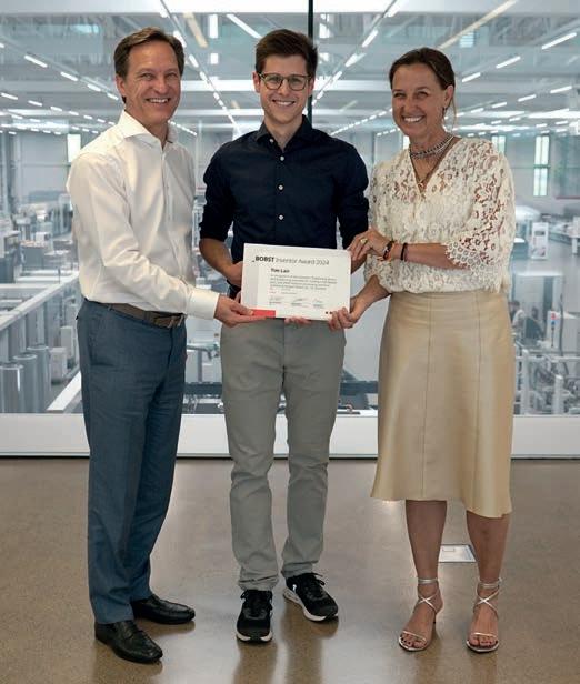 Tim Lair, Ingeniero de Fabricación Aditiva, recibe el Premio Inventor 2024. De izquierda a derecha: Jean-Pascal Bobst, CEO Bobst Group, Tim Lair, Sigrid Wagner, Bobst Group IP Director.