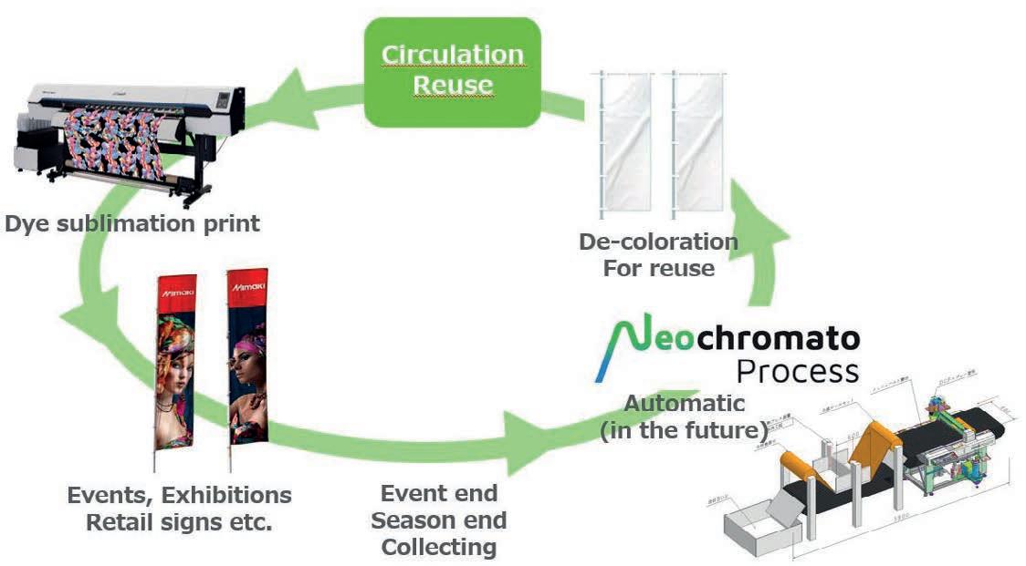Al decolorar los tejidos de poliéster teñidos con tecnologías de sublimación, este innovador proceso permite reimprimir o teñir inmediatamente los materiales, contribuyendo así a una economía circular más pequeña. No hay límite en el número de veces que el poliéster reutilizado puede tratarse con el proceso Neo-Chromato. Además, el propio proceso minimiza el uso de agua y la contaminación al permitir la eliminación del papel absorbente y los disolventes decolorantes utilizados en el proceso como residuos quemables.