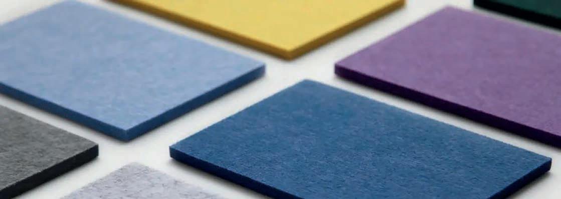cartón Re-Board®. Los paneles de fieltro Eco Sound RCY están fabricados de poliéster reciclado y no solamente son altamente decorativos, sino que además son fonoabsorbentes, llegando a absorber hasta un 80% la acústica de un nivel de ruido de 1000Hz, que es el ruido que genera el murmullo de una mesa de 4 en un restaurante. Estos paneles, pueden también personalizarse bien sea por impresión digital o por mecanizado y troquel. El cartón de construcción Re-Board® se utiliza para fabricar elementos de rotulación, expositores para el punto de venta y packaging sustituyendo a la madera. Tiene un denso núcleo de papel que proporciona una relación entre peso y rigidez sin igual: casi misma rigidez que la madera a menos de una cuarta parte del peso. Sus características para la instalación de alta calidad y una versatilidad extrema son solo algunos de los